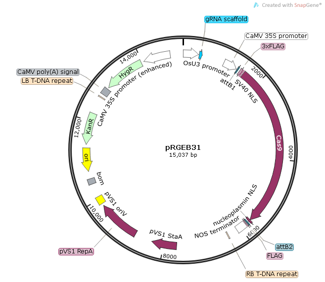 备注: Binary vector derived from pRGE31. Deliver sgRNA and Cas9 into plant. by agrobacterium mediated transformation.