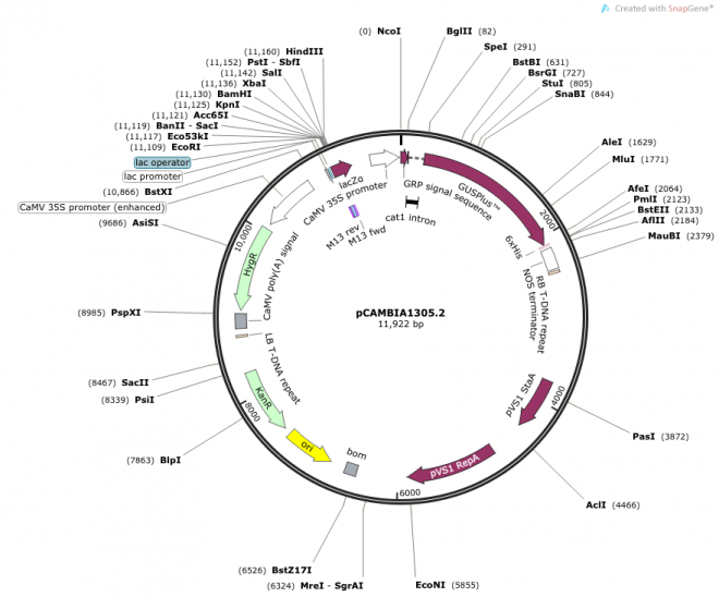 备注: pCAMBIA1305.2 where the .2 denotes the presence of the GRP signal peptide for in planta secretion of the GUSPlus™ protein.