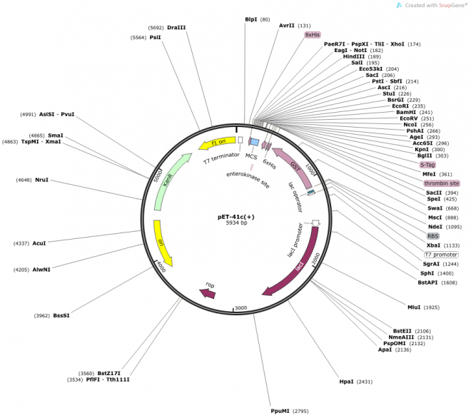 Encodes GST fusion tag; Nterm thrombin cleavage site; Nterm enterokinase cleavage site; PshAI blunt cloning site; a,b,c vary by MCS