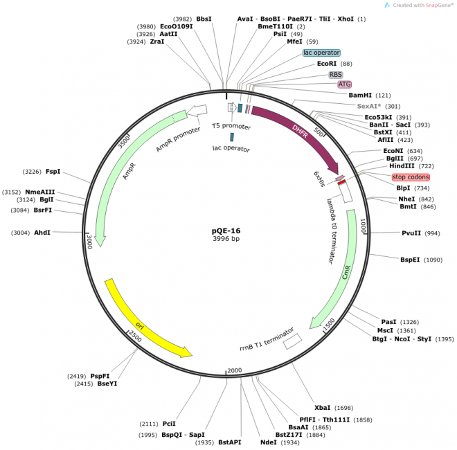 pQE vectors and constructs can be maintained in any E. coli strain that is ampicillin-sensitive and carries the pREP4 repressor plasmid, or harbors the lacIq gene on the F-factor episome.
