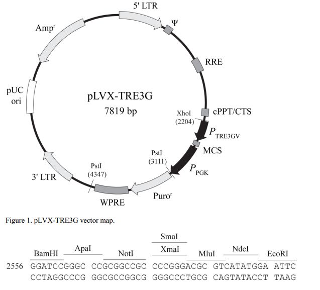 备注: 包含有Tet-On 3G反式激活蛋白,多西环素(doxycycline)诱导基因表达的慢病毒载体。
