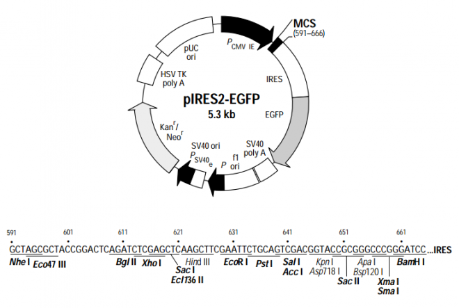 通过一个转录mRNA,能够同时表达EGFP蛋白和一个目的基因。
