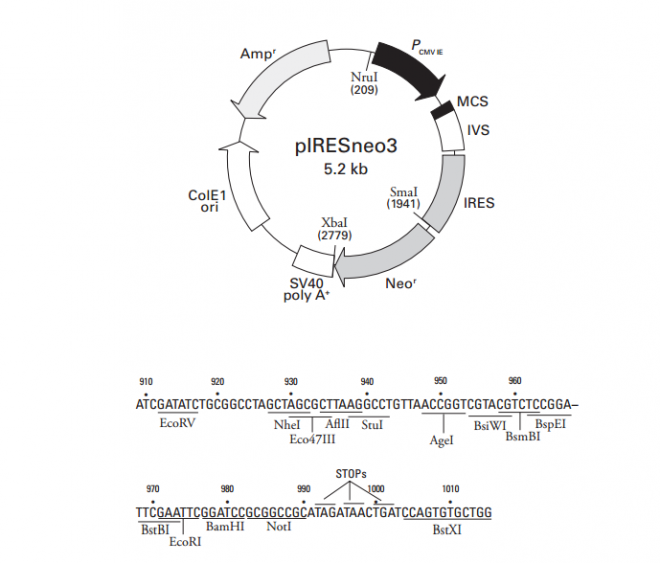 备注: pIRESneo3 contains the internal ribosome entry site (IRES) of the encephalomyocarditis virus (ECMV), which permits the translation of two open reading frames from one messenger RNA.